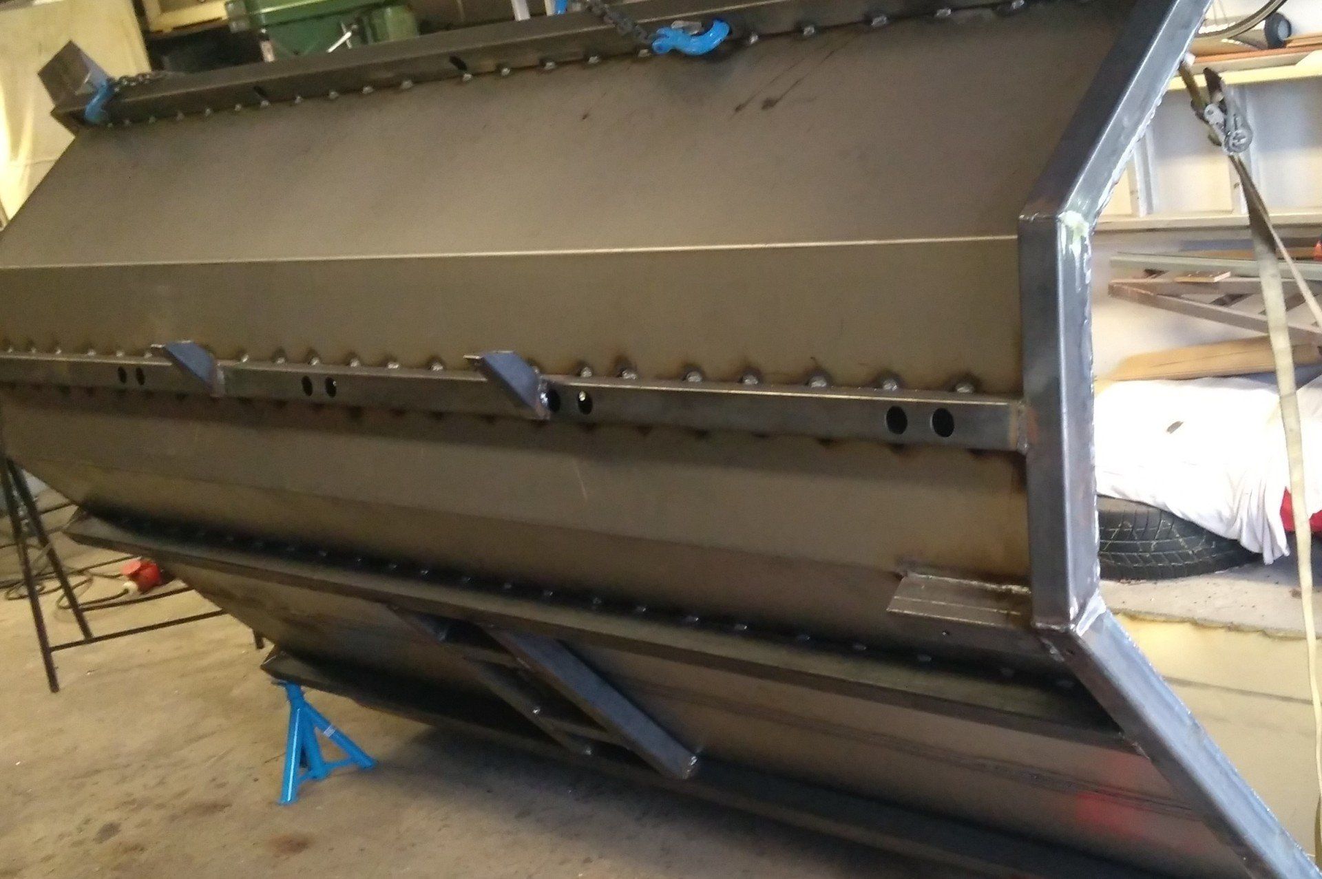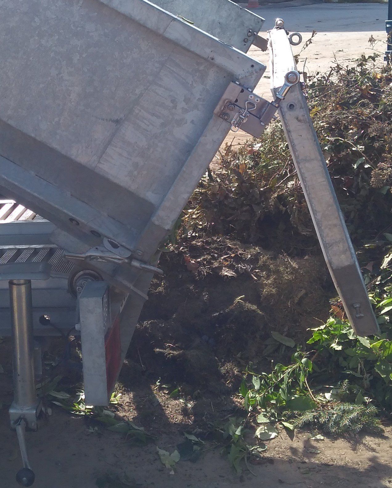 Die Mulde ist von innen mit Kunststoffplatten ausgekleidet, um ein Verkratzen der feuerverzinkten Oberfläche zu verhindern und ein Anhaften von Erde und Lehm so gering wie möglich zu halten.