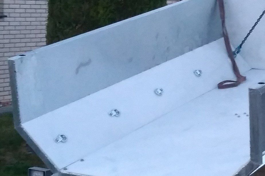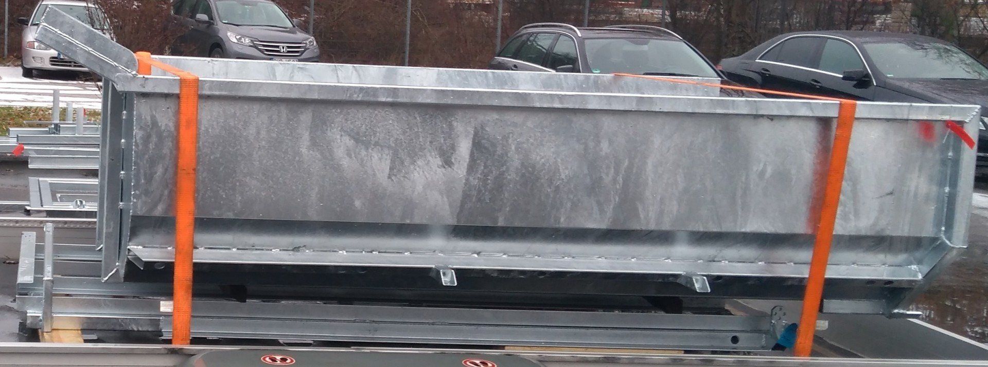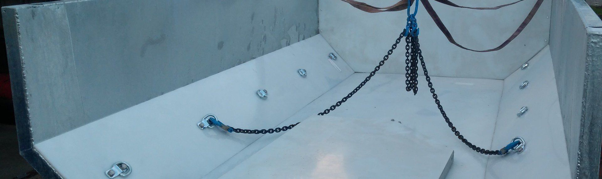 In der Mulde sind rechts und links jeweils fünf stabile Zurrösen fest mit dem Rahmen der Mulde verschraubt im Abstand von 50cm. Zudem sind außen im Rahmen auf beiden Seiten, im Abstand von 50cm, Bohrungen zum Einhaken von Spanngurten eingebracht.