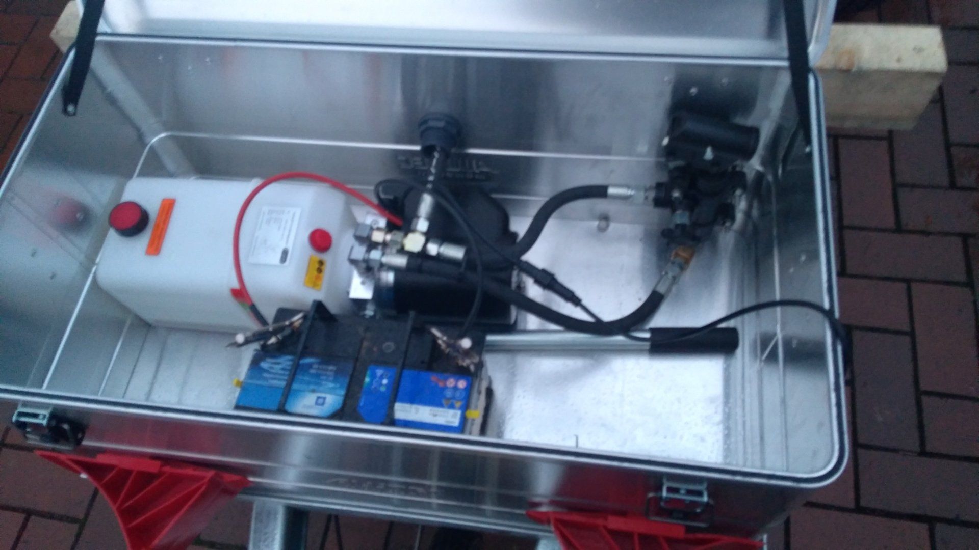 In der Aluminiumkiste auf der Deichsel sind Hydraulikaggregat, Hydrauliktank, 12 Volt Batterie, Ladegerät und Nothandpumpe untergebracht. Zudem bietet sie noch viel Platz für Spanngurte und Co.