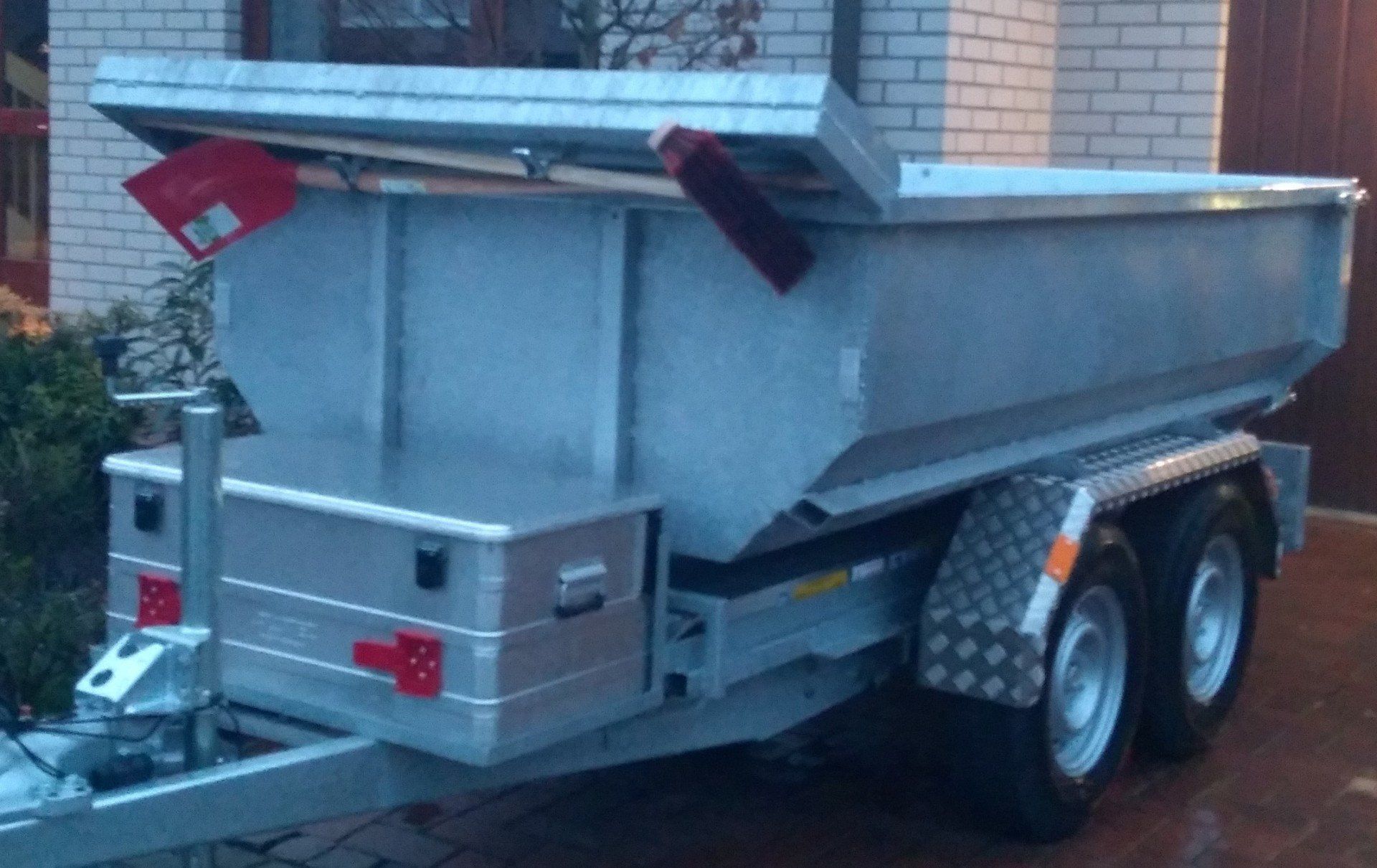 Unter der "Kappe" der Mulde sind Besen und Schüppe untergebracht, so lassen sich die Straße nach dem Beladen und der Anhänger selbst nach dem Abkippen von Erde und Co reinigen - lästiges Suchen von Besen und Schüppe entfällt.